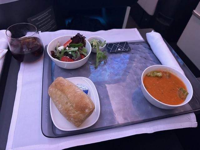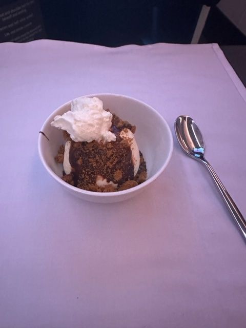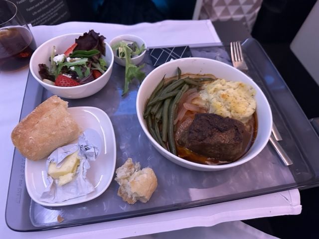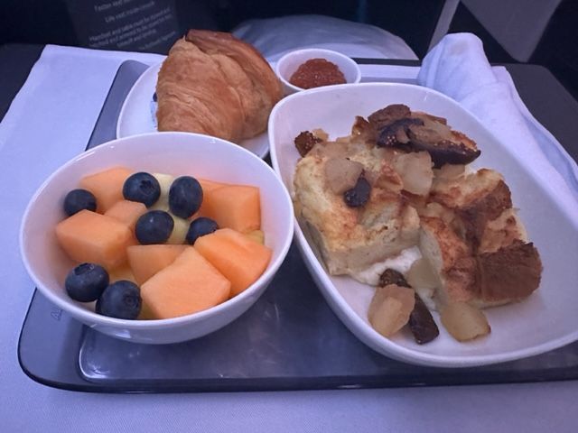 When we talk about service, think about a service that goes above and beyond. As soon as you settle in, before the flight departs, you will be offered a drink. For me, this is my mimosa time. Shortly after the aircraft is in the air, you will be served some snacks, your selection for main meal, and dessert. During my flight, as starters, I had tomato bisque, bread and strawberry salad. For dinner, braised beef short ribs, mashed potatoes and green beans. For dessert, I had an Ice Cream Sundae. In the morning, I was offered a nice hot cup of coffee, french toast, and a fruit salad.