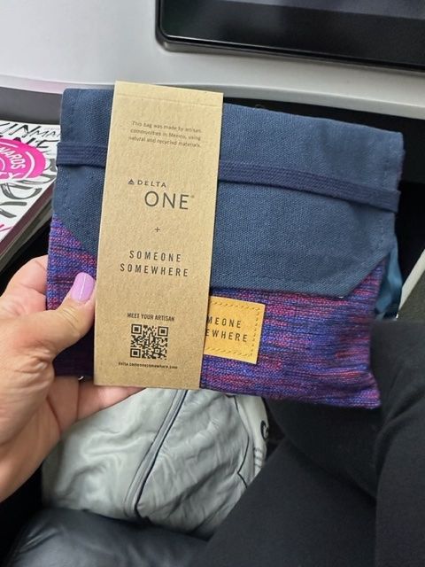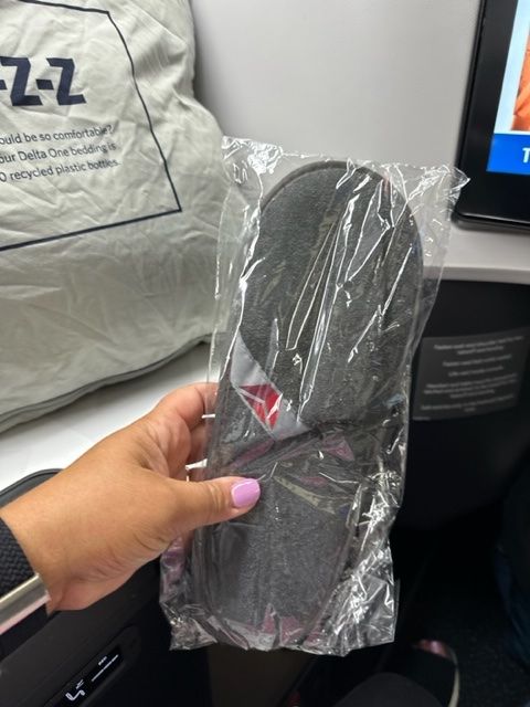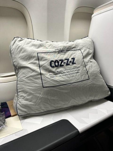 Once you enter the plane, you will find one of two styles of seats, depending on the aircraft. I was able to see at least two (2) different models of Delta One Suites. Both of them included the following items: a bag with a down-alternative pillow and a blanket, a pair of slippers, headsets, and an amenity kit. The amenity kit included a tooth brush, a lip balm, a pen, a hand cream, ear plugs, and a sleep mask. The pillow provided is medium sized and the blanket is large, very cozy, and warm.